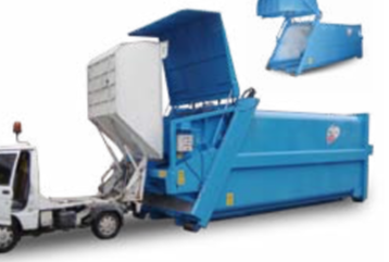 Compacteur amovible monopelle à déchargement antérieur par soulèvement de la bouche de charge et pelle d’expulsion intérieure. Utilisable pour déchargement en horizontal.